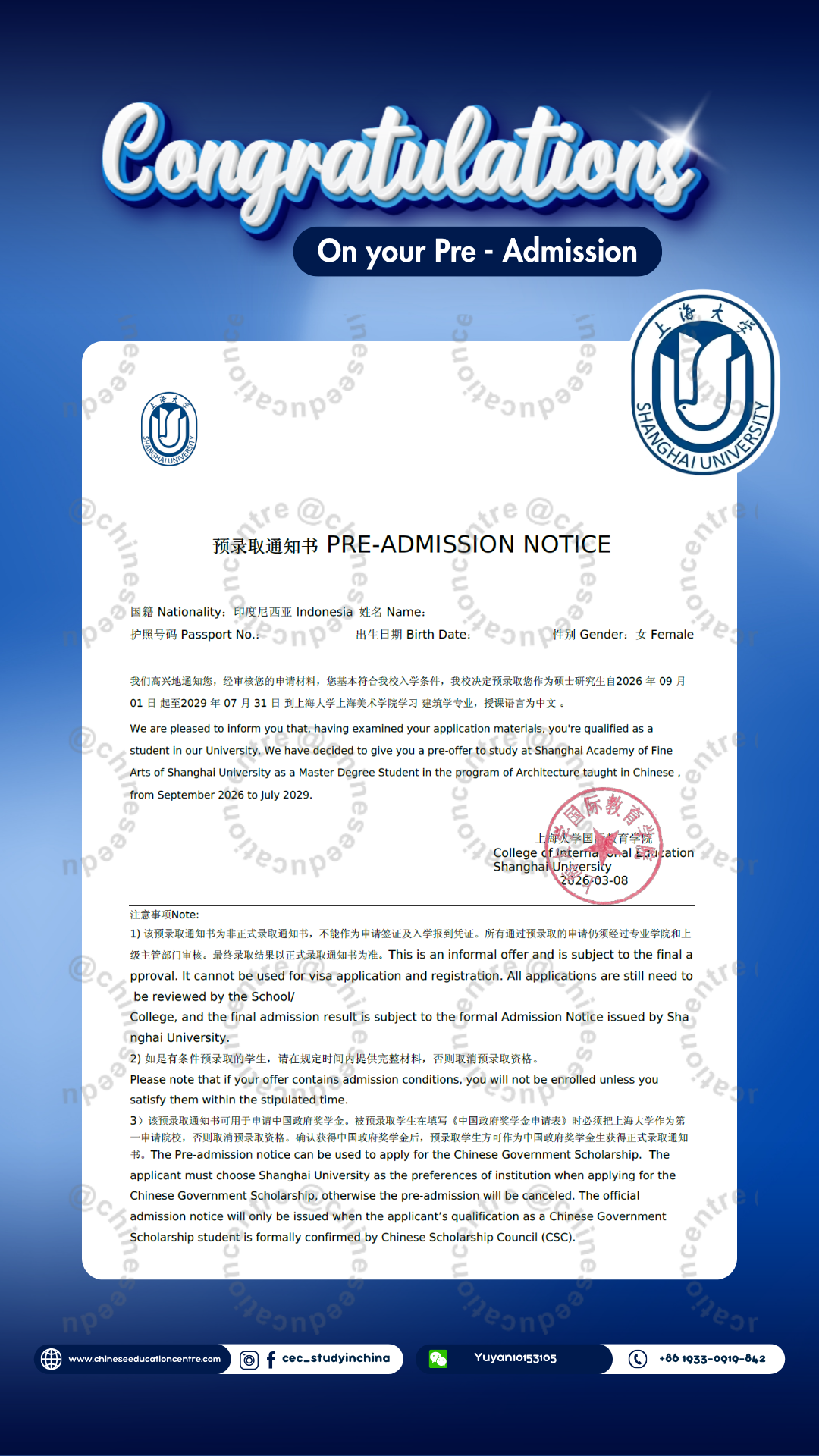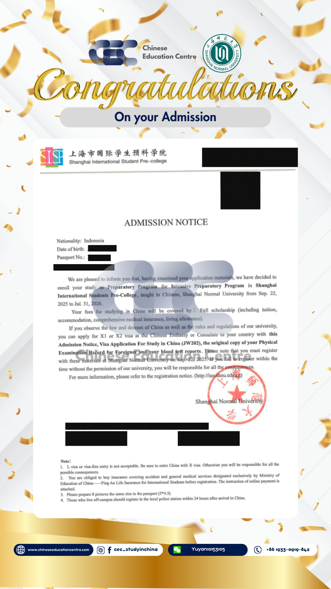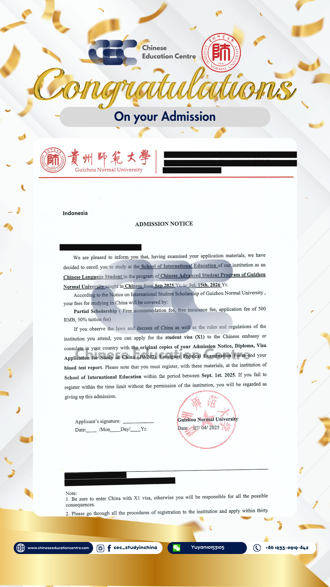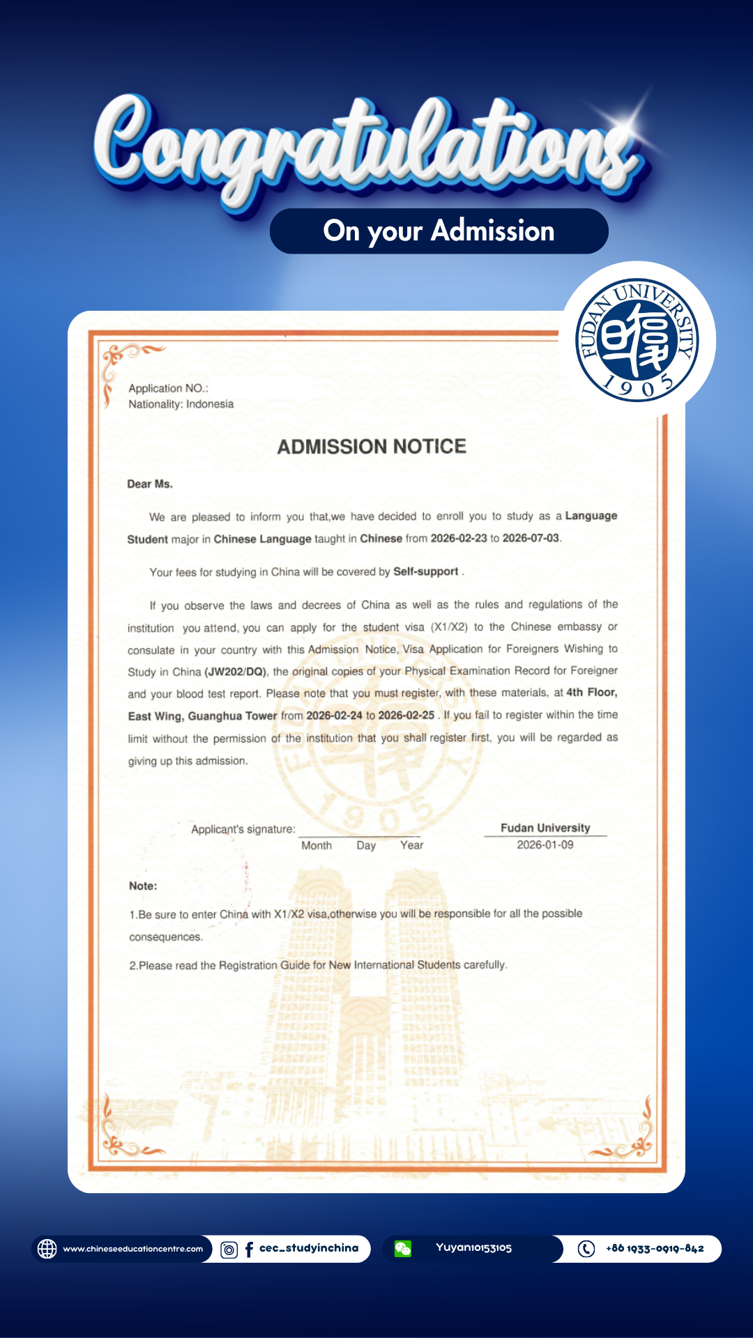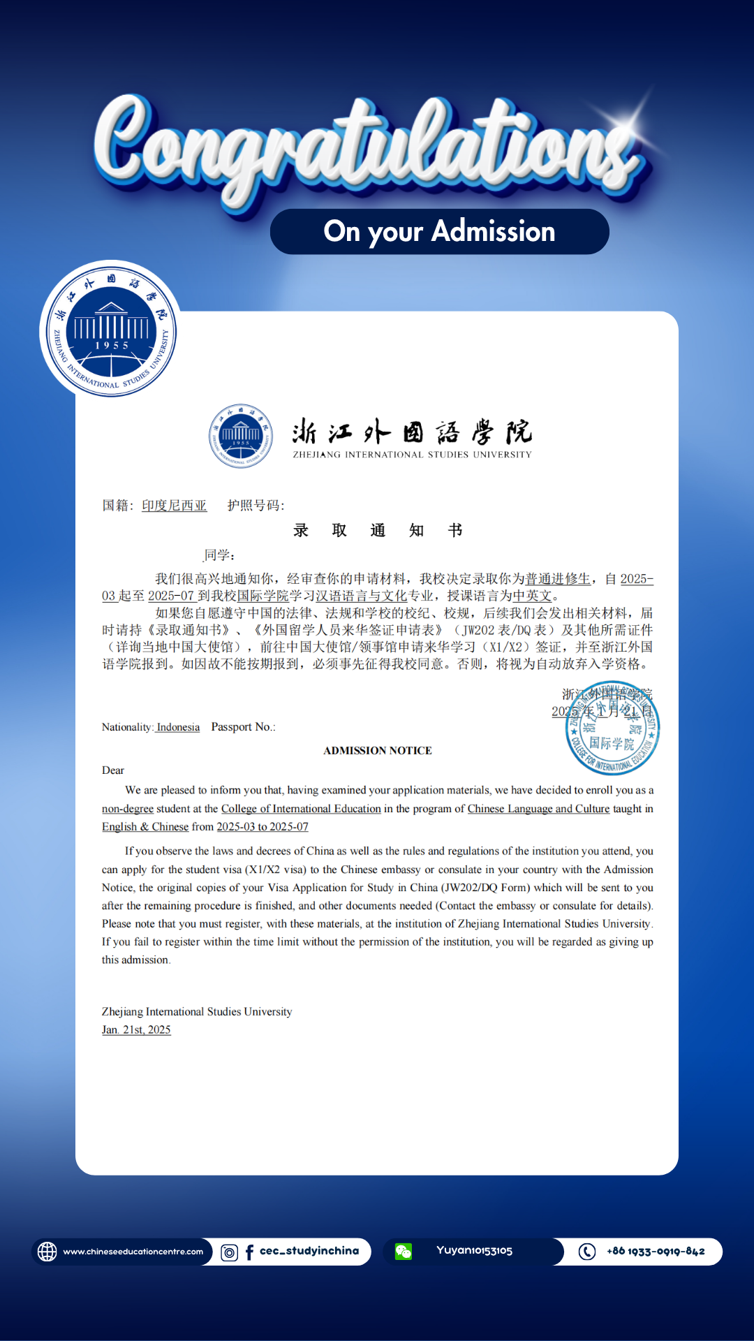Selain itu, kami juga dapat memberikan bukti Admission Notice. Dibawah ini merupakan Admission Notice resmi yang dikeluarkan langsung oleh pihak universitas di China. Dokumen ini menunjukkan bahwa siswa telah berhasil melalui seluruh proses seleksi dan secara resmi diterima sebagai mahasiswa. Admission Notice ini juga menjadi dasar penting dalam pengurusan dokumen lanjutan, termasuk visa pelajar dan registrasi kampus.