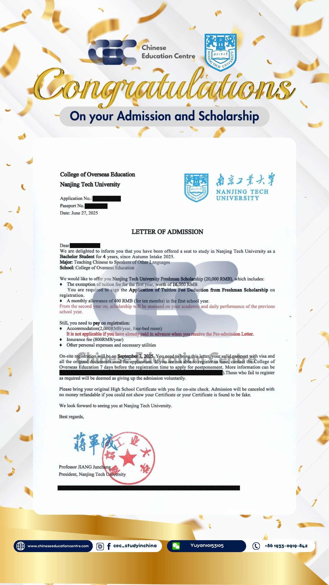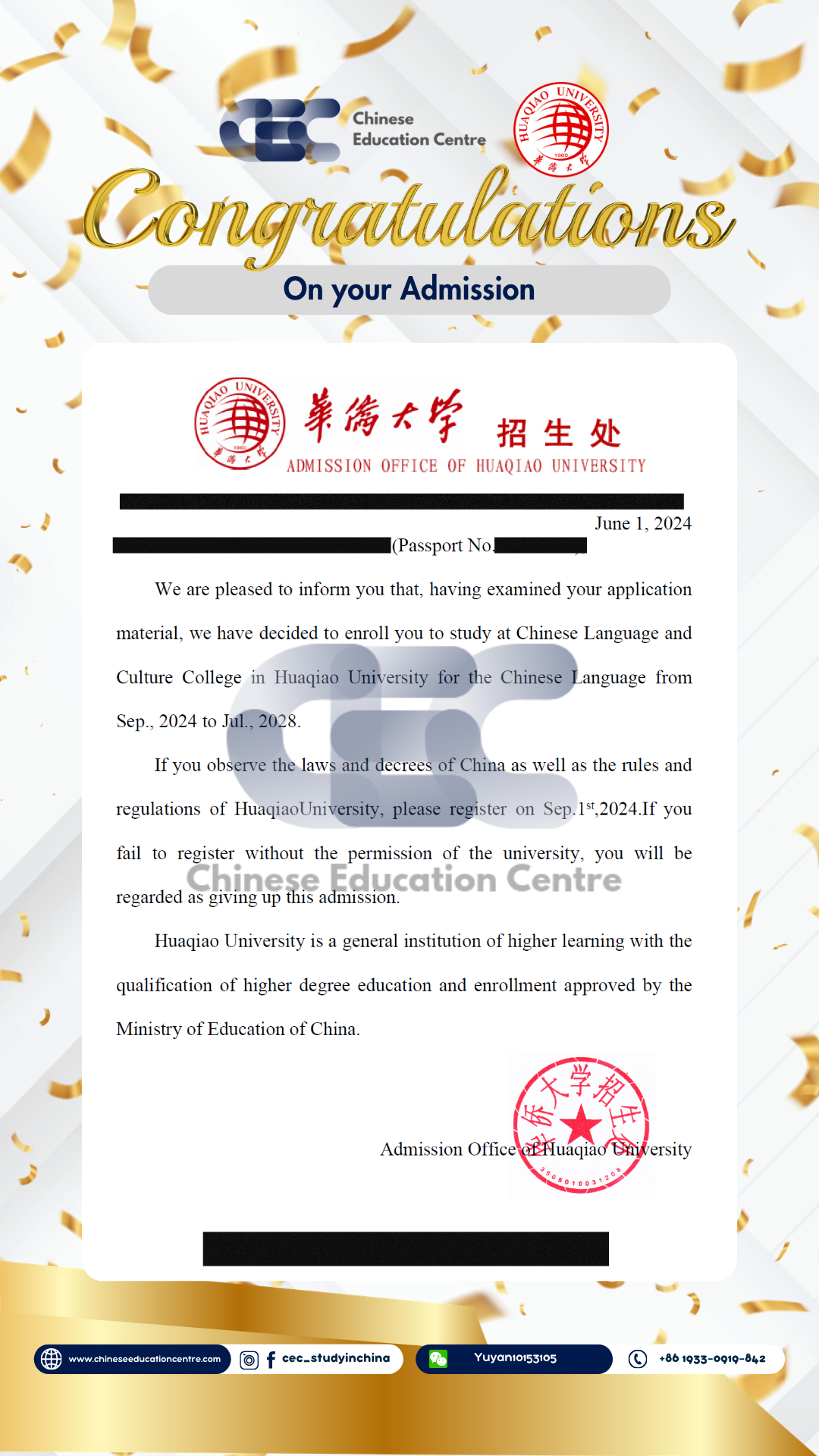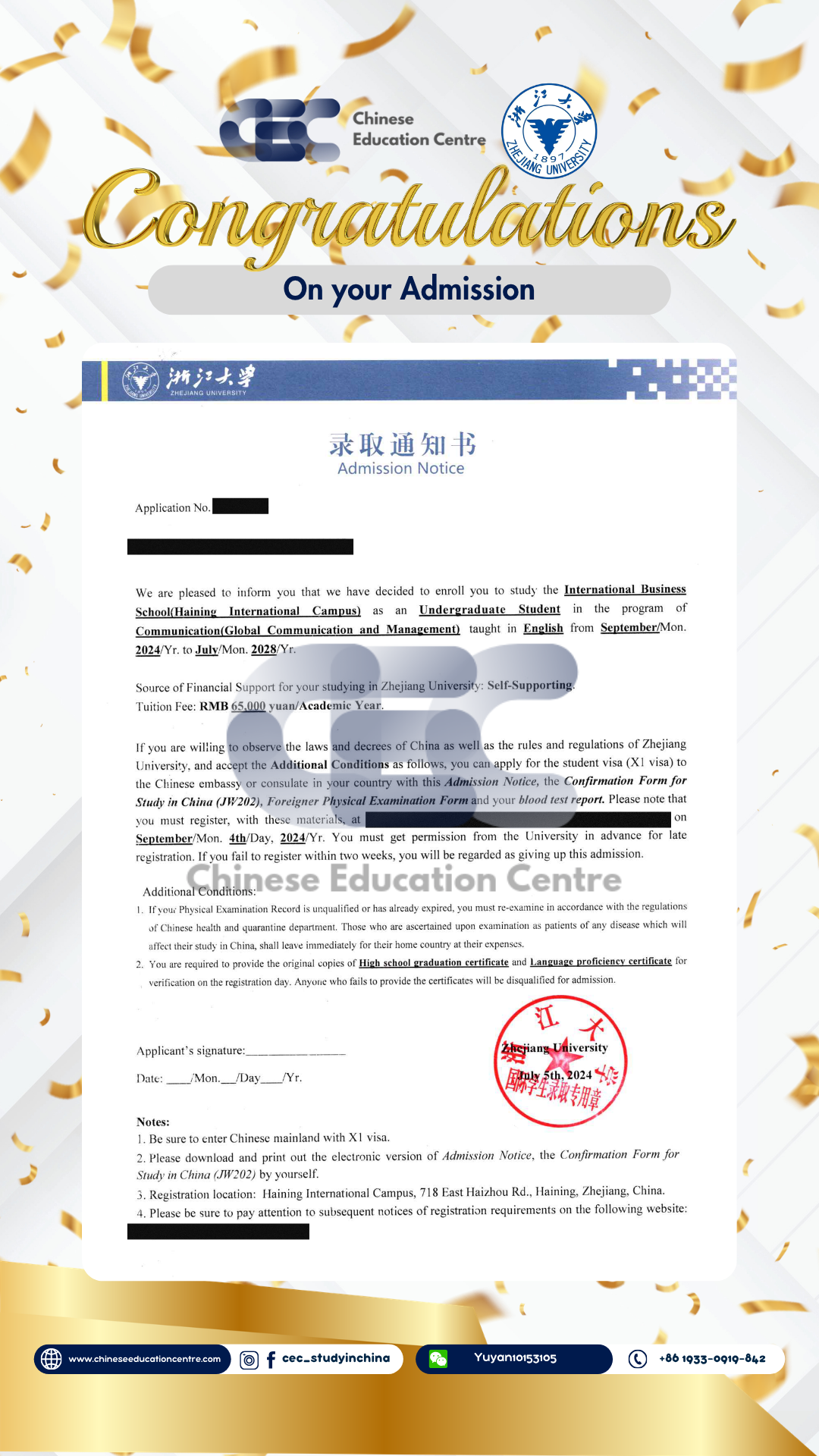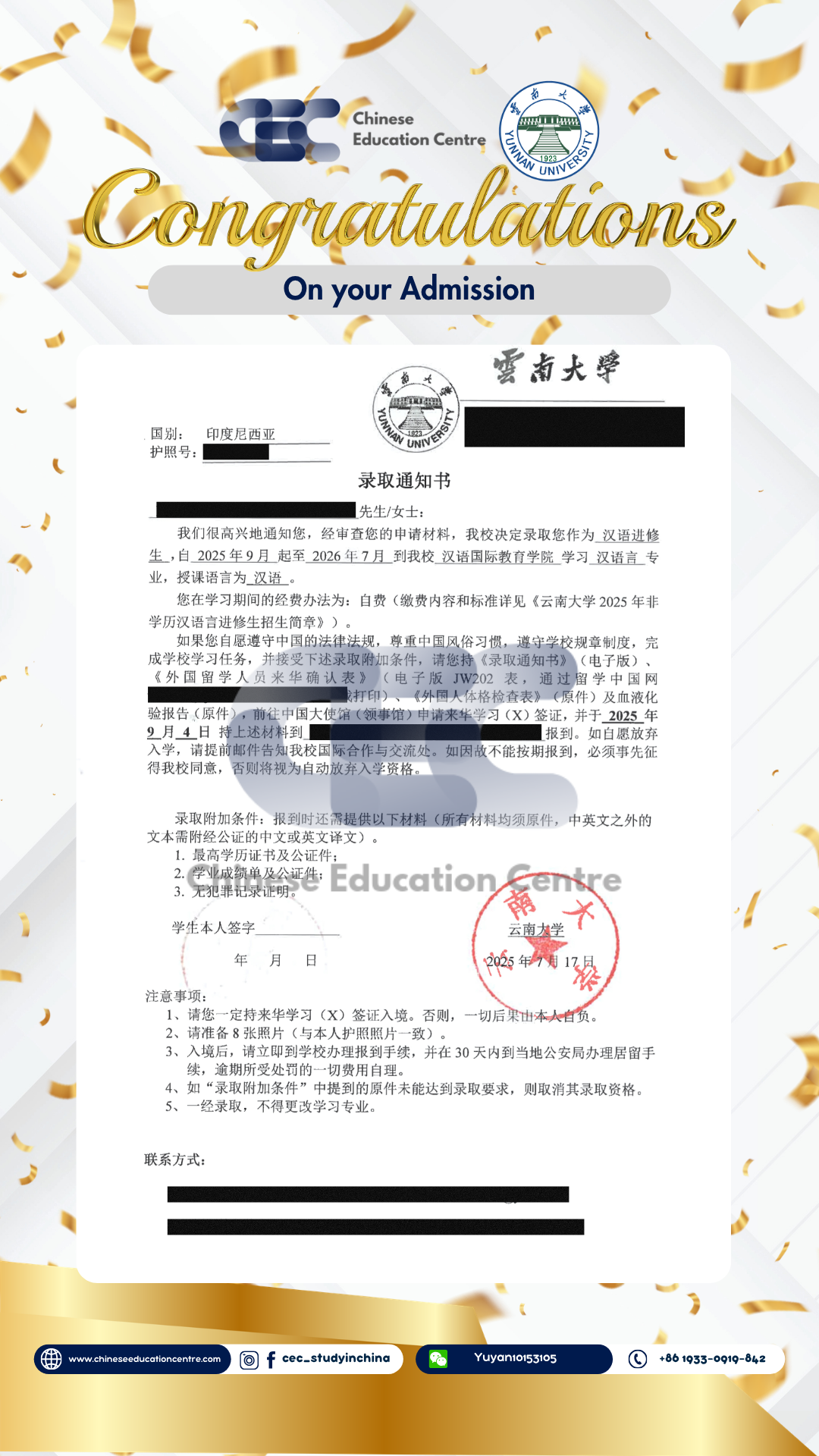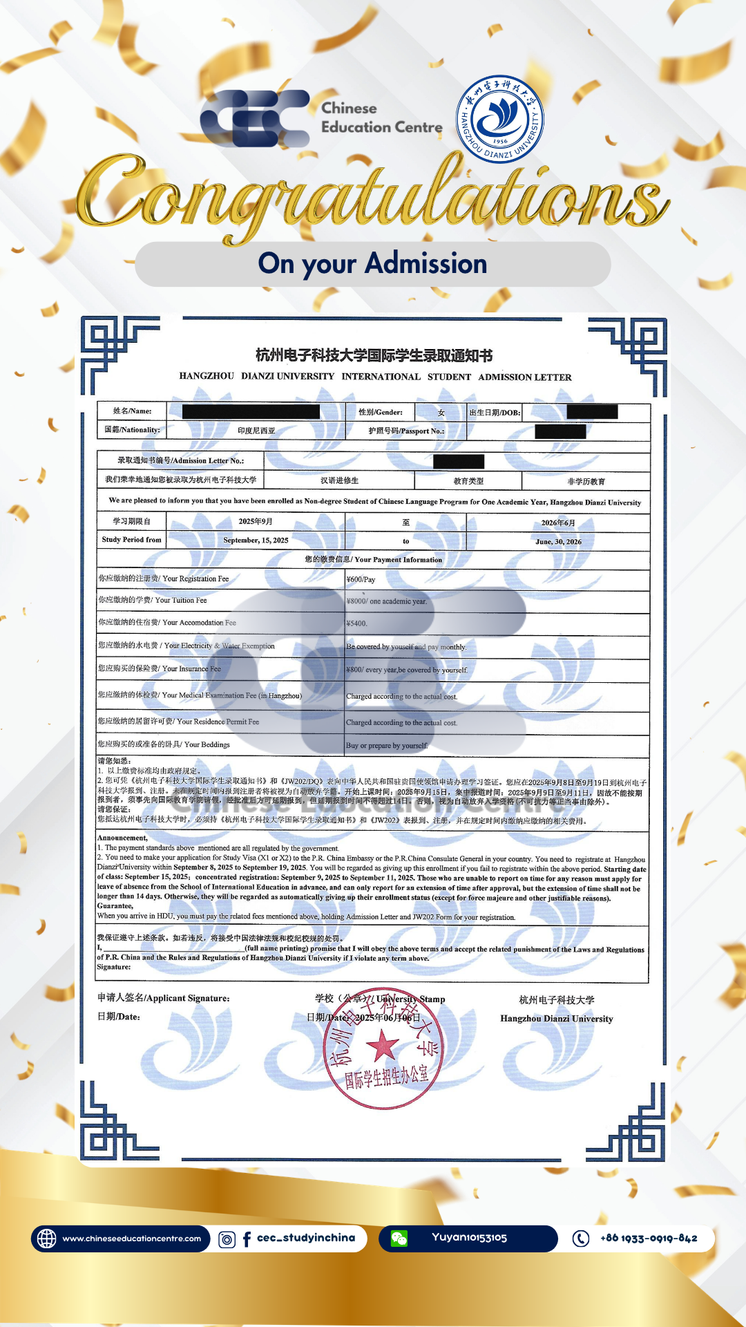 Selain itu, kami juga dapat memberikan bukti Admission Notice. Dibawah ini merupakan Admission Notice resmi yang dikeluarkan langsung oleh pihak universitas di China. Dokumen ini menunjukkan bahwa siswa telah berhasil melalui seluruh proses seleksi dan secara resmi diterima sebagai mahasiswa. Admission Notice ini juga menjadi dasar penting dalam pengurusan dokumen lanjutan, termasuk visa pelajar dan registrasi kampus.
