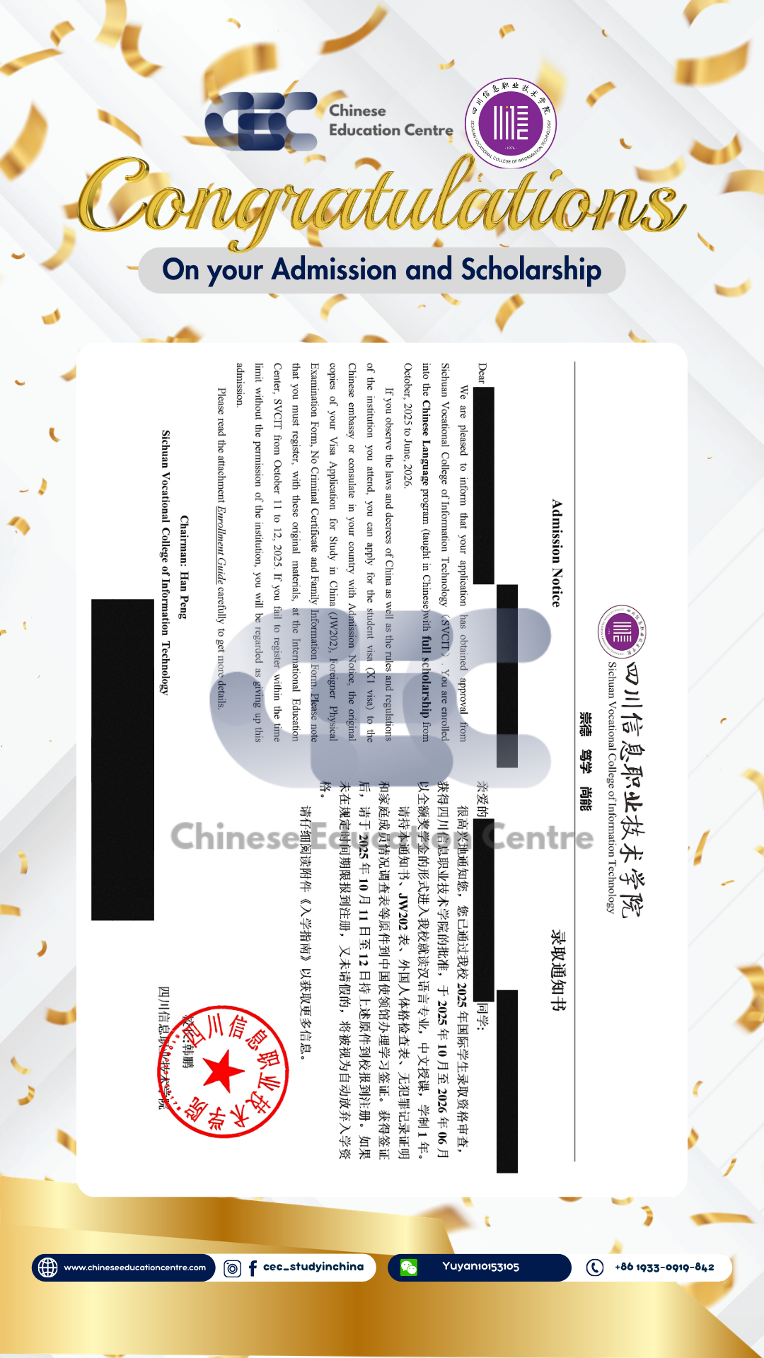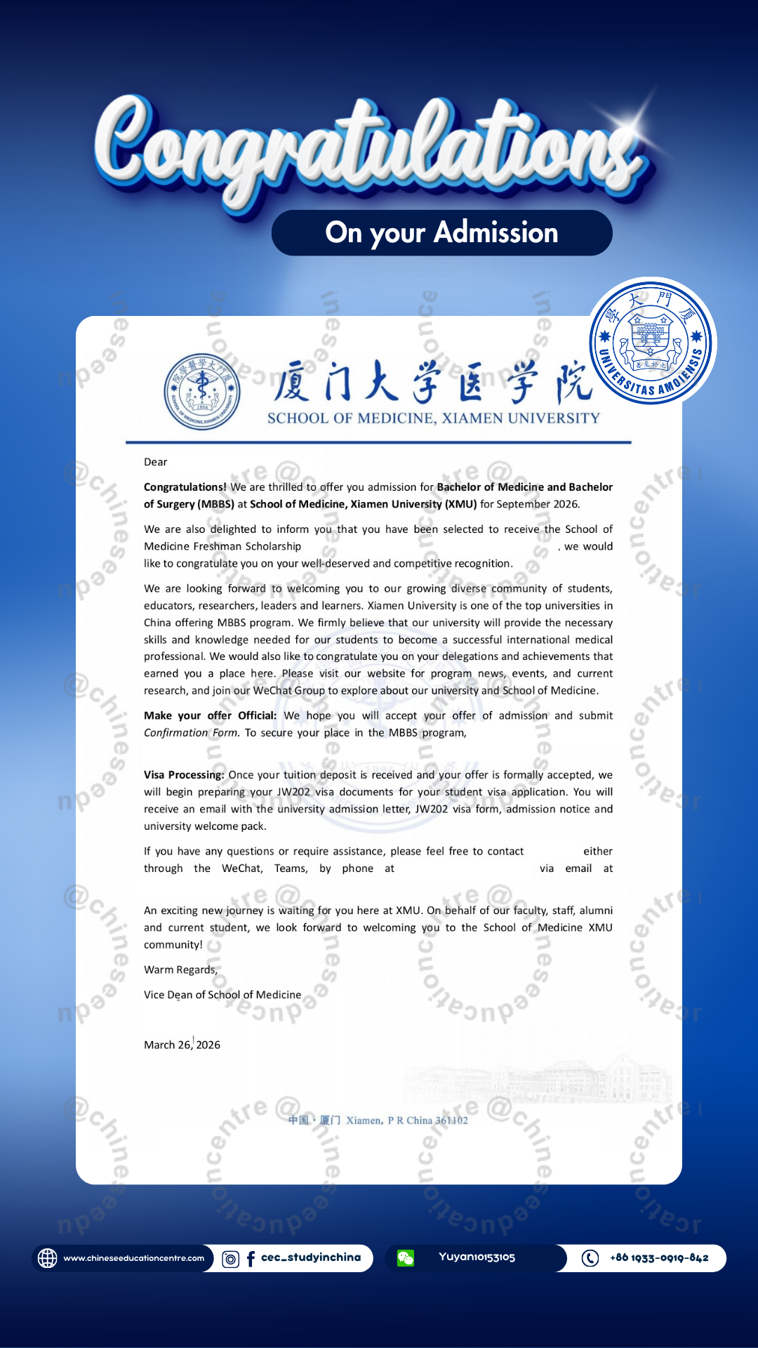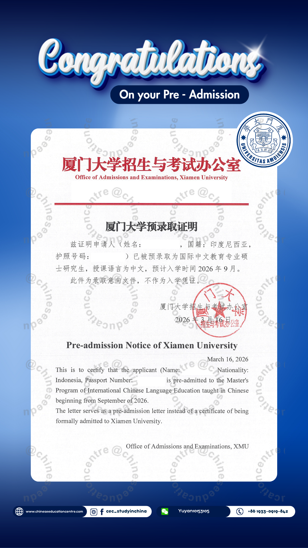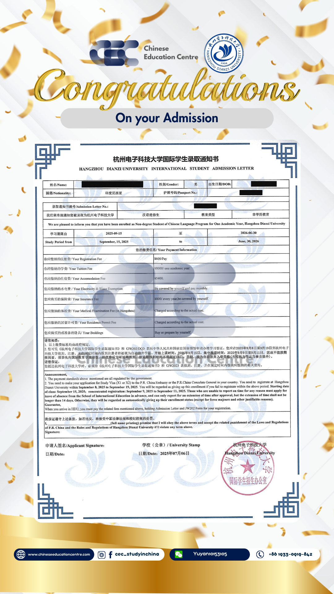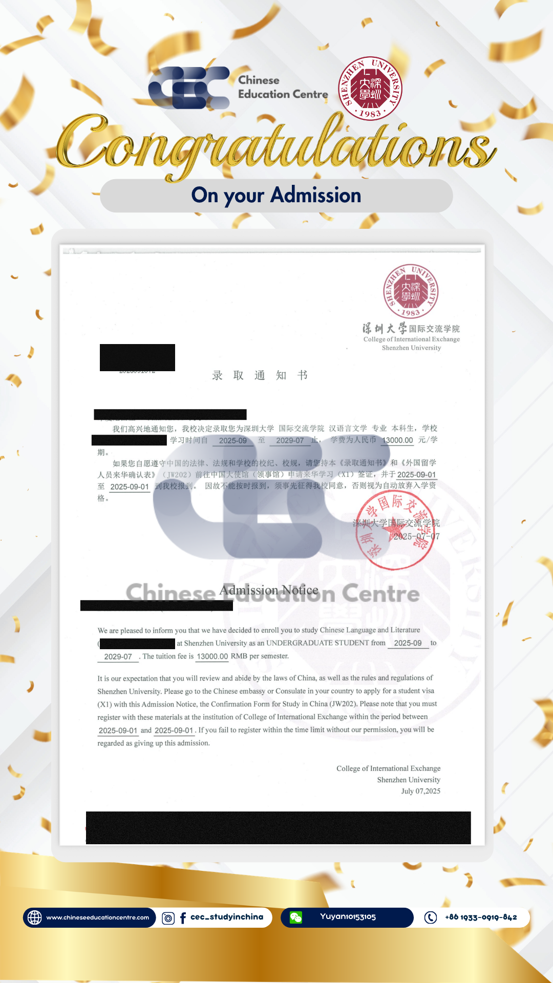 Selain itu, kami juga dapat memberikan bukti Admission Notice. Dibawah ini merupakan Admission Notice resmi yang dikeluarkan langsung oleh pihak universitas di China. Dokumen ini menunjukkan bahwa siswa telah berhasil melalui seluruh proses seleksi dan secara resmi diterima sebagai mahasiswa. Admission Notice ini juga menjadi dasar penting dalam pengurusan dokumen lanjutan, termasuk visa pelajar dan registrasi kampus.